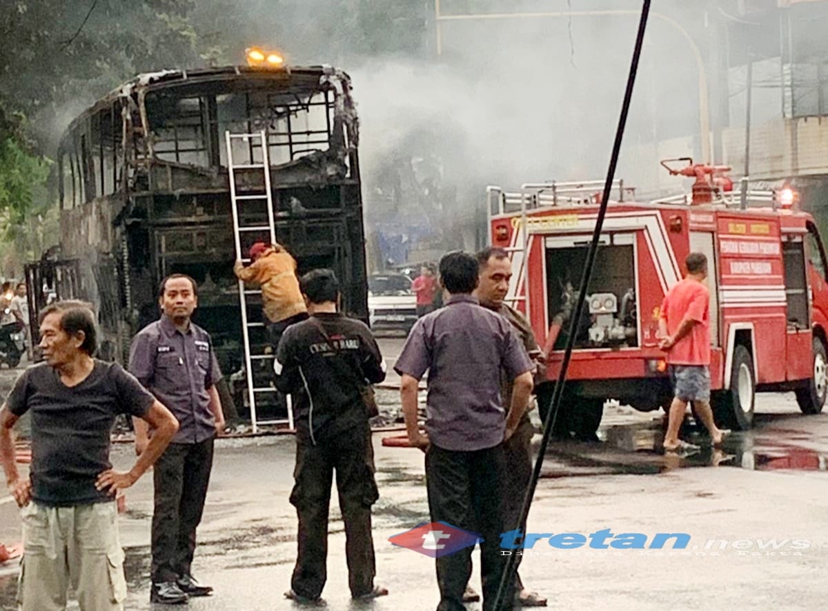 PAMEKASAN, tretan.news – Sebuah kendaraan bus mengalami kebakaran hebat hingga ludes terbakar